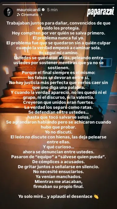 Desde sus stories, Mauro dejó en claro que todo es cuestión de tiempo y que la verdad sale a la luz tarde o temprano. “Trabajaban juntos para dañar, convencidos de que el ruido los protegía. Hoy compiten por ver quién se salva primero. El problema nunca fui yo”. comenzó diciendo luego de que Rosefeld se refiriera a la "mala influencia" de Payarola para con Wanda Nara.