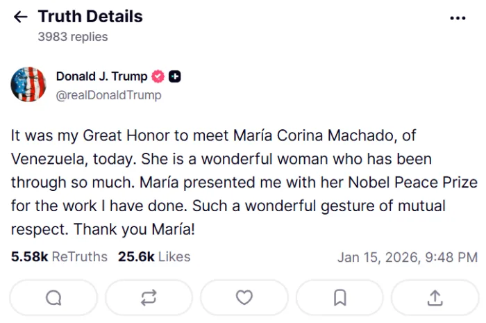 El anuncio llegó después de varios días de versiones cruzadas y de que el propio Comité del Nobel recordara que el galardón es irrevocable e intransferible. Aun así, Trump afirmó en sus redes que Machado le ofreció la medalla como reconocimiento a su rol en la defensa de la libertad en Venezuela.